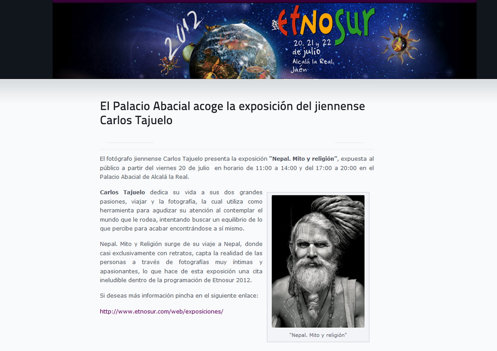 Etnosur 2mil12 nos presenta la exposición fotográfica “Nepal. Mito y religión”, obra realizada por el fotógrafo jiennense Carlos Tajuelo y que estará expuesta al público a partir del viernes 20 de julio en el Palacio Abacial de Alcalá la Real.