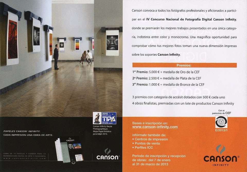 Un concurso de prestigio, IV Concurso Nacional de Fotografía Digital Canson Infinity hasta el 31 de marzo de 2013, tanto por premios como por patrocinio con el auspicio de la CEF, y una Beca destinada a la creación del 1 de marzo al 15 de abril, Grand Prix International Henri Cartier-Bresson, para fotógrafos que hayan alcanzado la suficiente sensibilidad documental y quieran apostar por un punto de inflexión en su trayectoria.