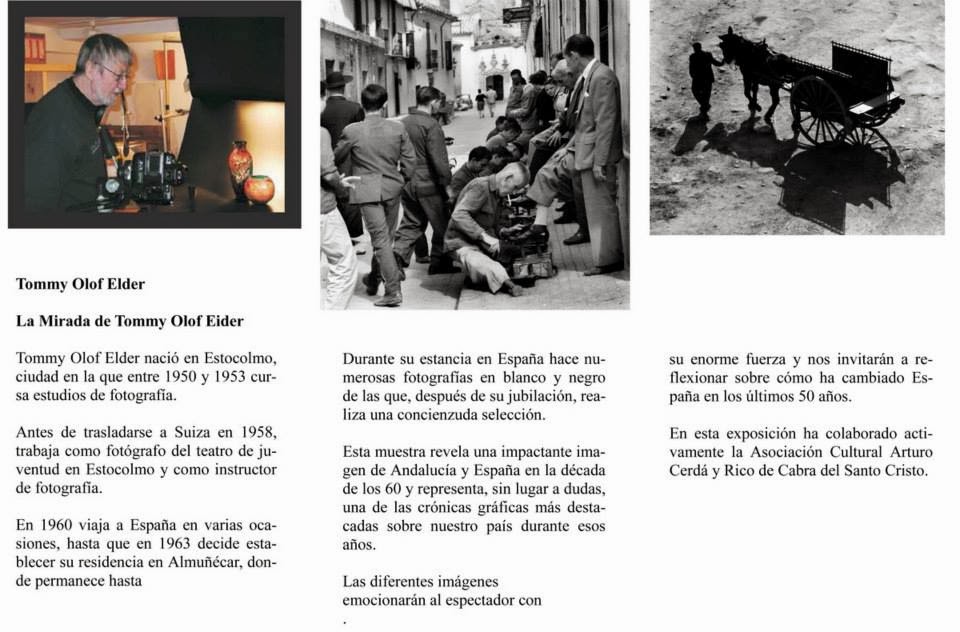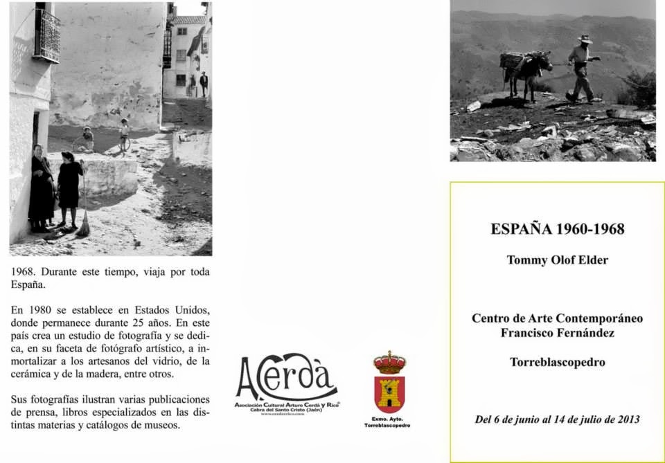 Hoy 6 de junio se inaugura en el Centro de Arte Contemporáneo "Francisco Fernández" en calle Pilar nº 58 de Torreblascopedro (Jaén) la exposición temporal ESPAÑA 1960-1968 de Tommy Olof Elder en la que ha colaborado la Asociación Arturo Cerdá y Rico de Cabra del Santo Cristo. Se podrá ver hasta el 14 de julio en horario de 18:00 a 20:00 horas de lunes a viernes. Una muestra que nos invitará a reflexionar sobre cómo ha cambiado España en los últimos 50 años.