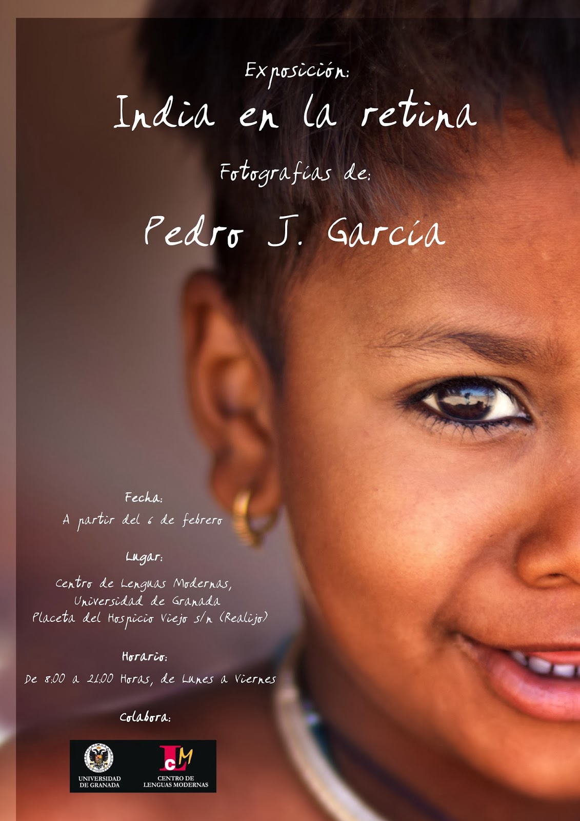 A partir del 6 de Febrero, en el Centro de Lenguas Modernas de la Universidad de Granada, se podrá visitar en horario de lunes a viernes de 8.00 a 21:00 horas, la exposición "India en la retina" de Pedro J. García. Esta exposición que pone su acento en el color de La India ya se pudo ver en Jaén y Torredonjimeno (Jaén).